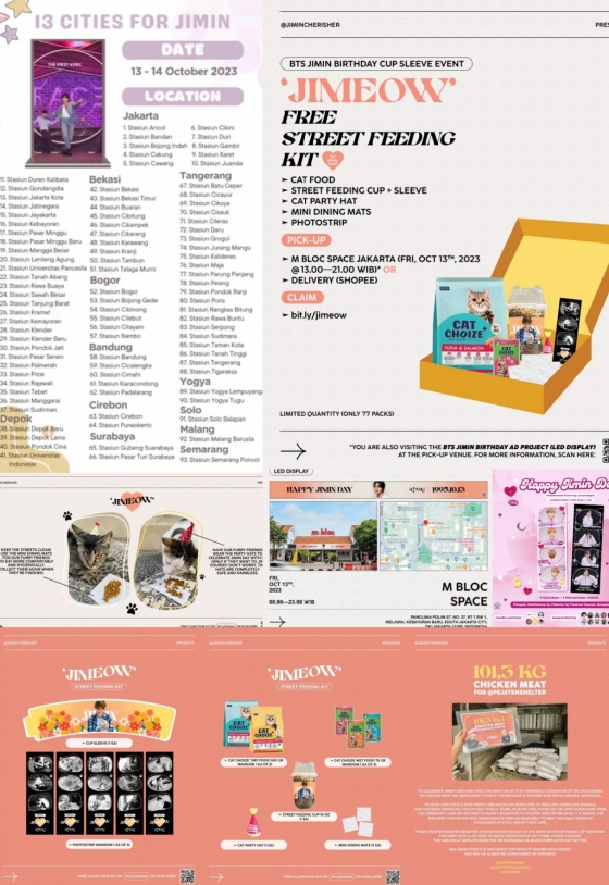 또한 길고양이들을 위한 생일 컵 슬리브 이벤트를 통해 'JIMEOW (JIMIN+MEOW) 길거리 무료 급식 키트'를 배포하였으며 지민의 생일에는 'M Bloc Space'에서 추가로 고양이 드라이 푸드를 나눠주며, 인도네시아의 유기견 보호 센터 'Shelterpejaten'에 위탁견을 돕기 위해 기부했다고 알렸다.