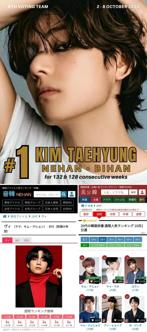 뷔는 같은 기간 한국 배우 인기 랭킹 사이트 '비한'(BIHAN)의 '20대 한국 배우' 부문 투표에서도 128주 연속 1위에 올라 K팝 아티스트이자 배우로서 확고한 위상도 빛냈다.