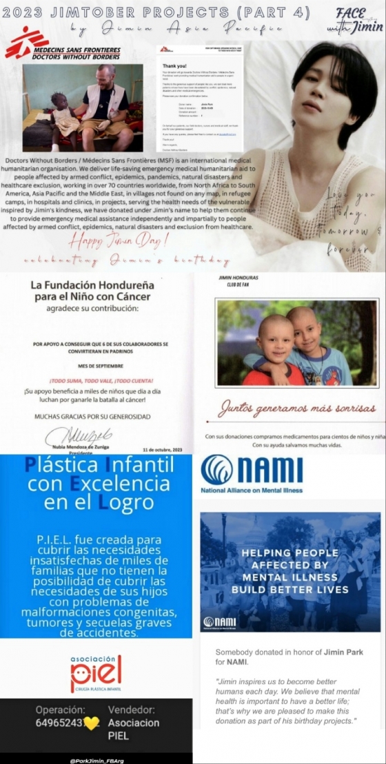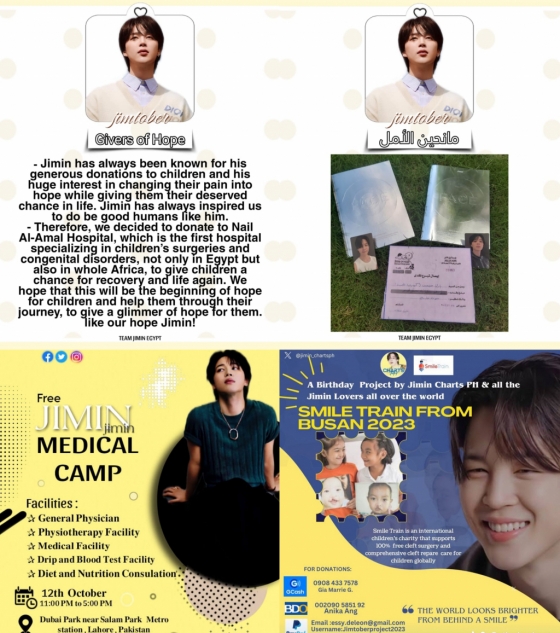 'jiminegypt1'은 이집트와 아프리카 전역에서 최초로 아동 수술 및 선천성 질환을 전문으로 하는 병원인 나일 오브 호프(Nile of Hope)에, 'jiminpromotion'는 지민 생일 프로젝트의 일환으로 미국에 기반을 둔 비영리 정신질환 연맹 NAMI(National Alliance on Mental Illness)에 기부금을 기탁했다.