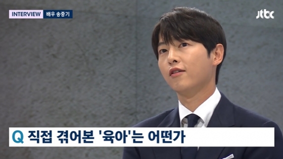 송중기는 직접 겪은 육아 고충도 털어놨다. "와이프하고 씩씩하게, 함께 서로 잘하고 있다는 생각을 하고 있다"는 송중기는 "서로 굉장히 으쌰으쌰 하고 있다. 굉장히 뿌듯한 일인 것 같다. 그래서 요즘에 굉장히 행복함이 충만하다"라며 웃었다.