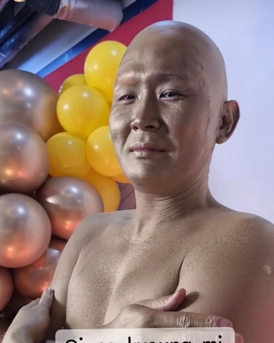 사진 속 윤형빈은 상의를 탈의한 채 대머리 분장을 하고 있는 모습. 창피한 듯 두 손으로 가슴을 가리며 쑥스러운 표정을 짓고 있다. 정경미는 또렷한 이목구비를 더욱더 강조한 메이크업과 진한 립스틱, 올림 헤어스타일 등으로 보는 이들을 폭소하게 만들었다.