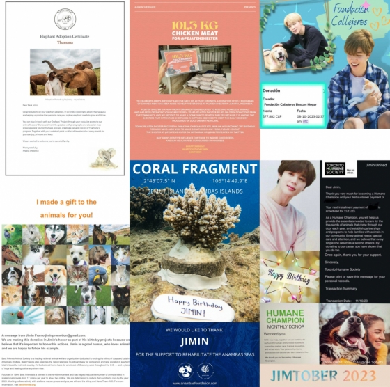 지민 칠레(PARKJIMIN_CHILE)는 유기 동물의 구조와 입양 및 마이크로칩 이식 등 일년 내내 다양한 캠페인을 펼치고 있는 'Street Search Home Foundation'에 기부금을 전달했으며, 지민케냐(Jimin Kenya) 또한 2021년부터 후원해오고 있는 아기 코끼리 '타마나'(Thamana)에 대한 후원을 올해도 이어간다.