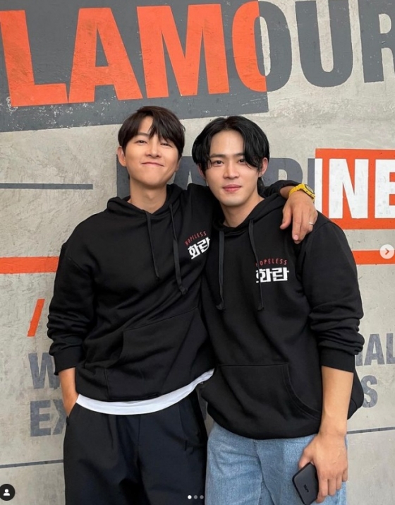 이와 함께 공개된 사진에는 송중기가 배우 정재광과 어깨동무를 하고 영화 '화란' 홍보에 나선 모습이 있었다.