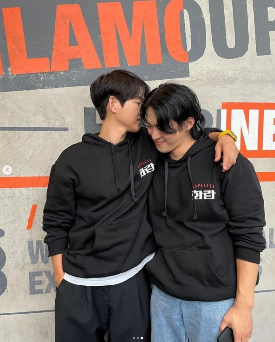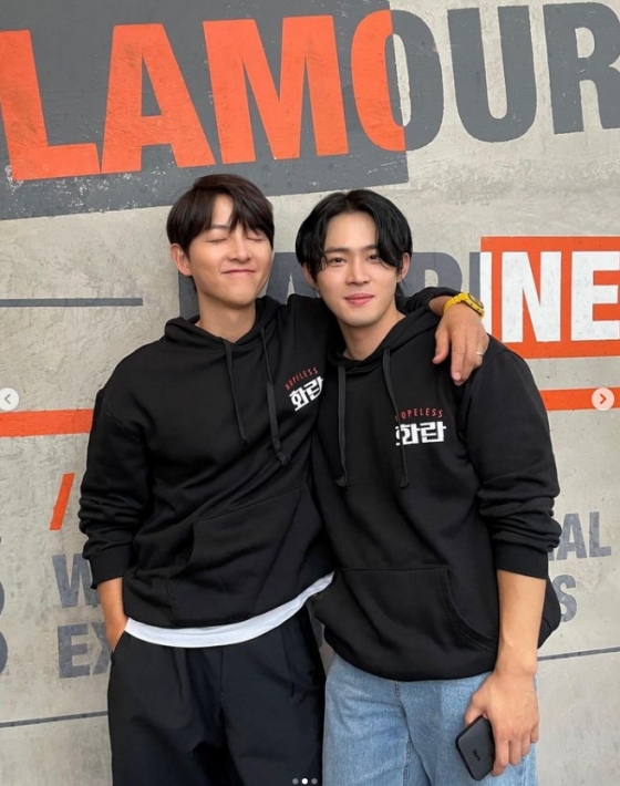 두 사람이 '화란' 글씨가 적힌 후드티를 입은 가운데, 송중기는 해사한 미소를 지으며 극강의 청년미를 뽐냈다. 송중기는 1985년생으로, 38세의 만 나이를 가늠하기 힘든 동안도 자랑했다.