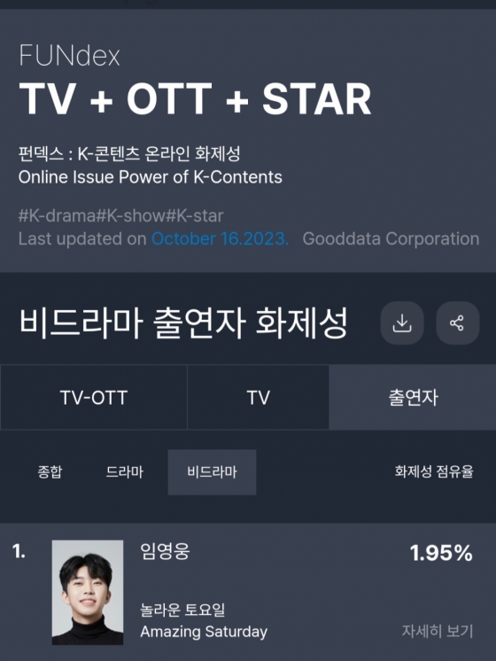 임영웅은 굿데이터코퍼레이션이 10월 16일 발표한 K-콘텐츠 온라인 화제성 FUNdex에서 비드라마 출연자 화제성 1위를 차지했다.
