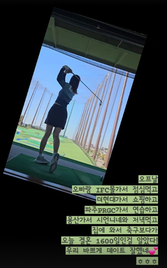17일 민혜연은 "오프날 오빠랑 IFC몰 가서 점심 먹고 더현대 가서 쇼핑하고 파주 PRGC 가서 연습하고 용산 가서 시언니네와 저녁 먹고 집에 와서 축구 보다가 오늘 결혼 1600일인 걸 알았다"고 밝혔다.