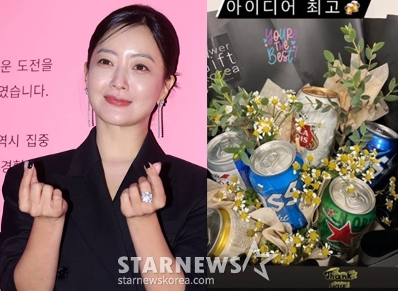 연예계 애주가로 알려진 배우 김희선이 맥주가 꽂힌 꽃다발을 선물받았다.
