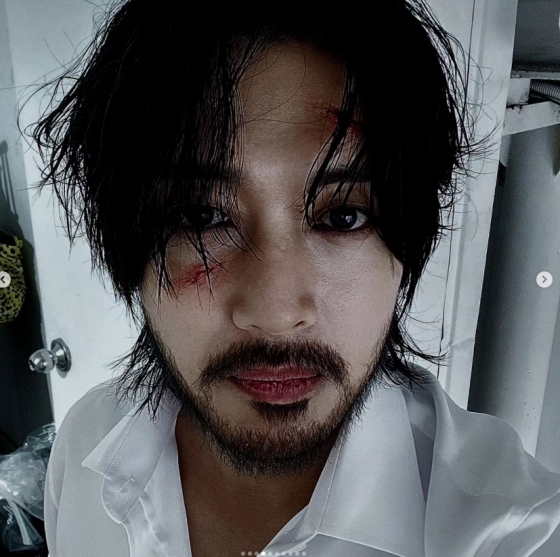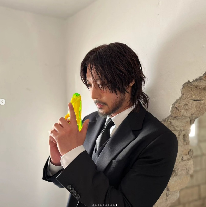 김현중이 공개한 사진 속에는 긴 머리에 수염을 붙인 그가 촬영에 나선 모습이 있었다. 김현중은 수트 차림에 장난감 총을 들고 누아르에 도전한 모습. 그는 총을 맞는 연기에 몰입하기도 했다.