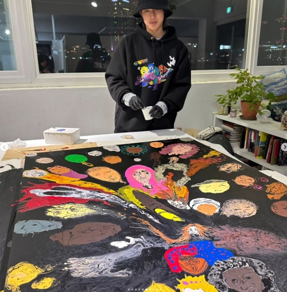 또 다른 사진에선 김현중이 자신만의 화풍으로 큰 캔버스에 개성있는 그림을 그렸다.