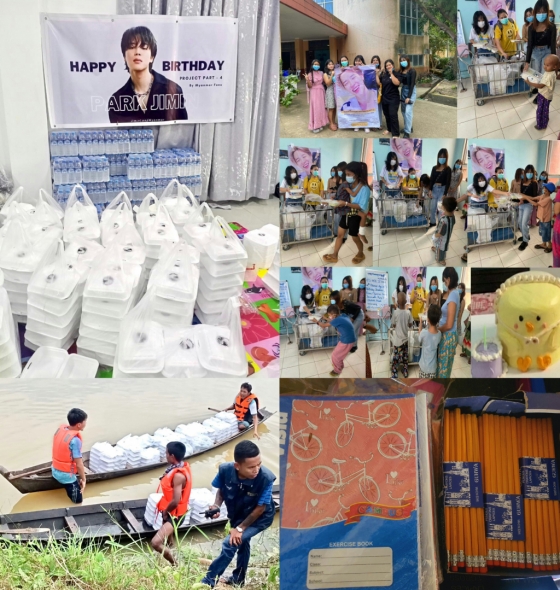 또 다른 팬 'kingofkpopjm'과 미얀마 팬들도 지민의 생일 기념 프로젝트 일환으로 현지 아동병원에서 암으로 고통받고 있는 100명의 어린이들에게 식사를 제공하고 'WITH JIMIN TILL THE END(끝까지 지민과 함께)'라는 문구로 지민을 향한 끝없는 애정을 표현했다.