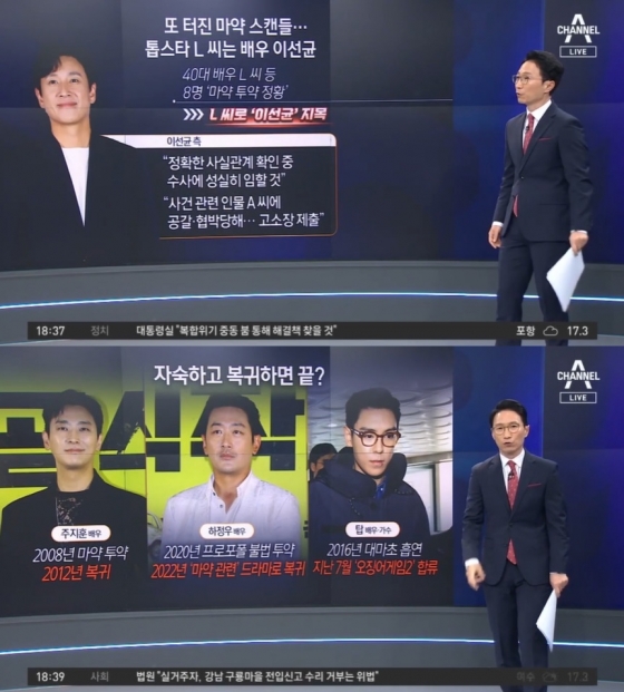 특히 천상철 앵커는 "과거에도 연예인들이 마약에 대해 쉽게 생각하고 마약 범죄를 저지르는 바람에 국민들이 많이 실망했었다. 문제는 마약 범죄를 일으킨 다음에 복귀를 한다"라며 주지훈, 하정우, 빅뱅 출신 탑을 언급했다.