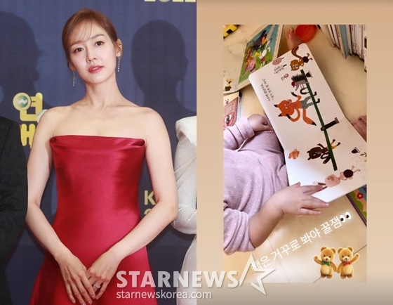 23일 성유리는 "책은 거꾸로 봐야 꿀잼"이라며 독서 중인 딸의 모습을 귀여워했다.