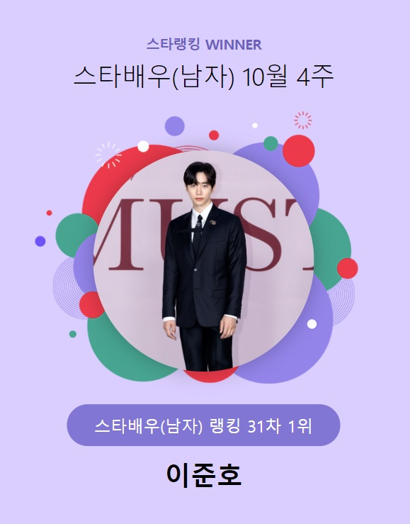 이준호는 지난 19일 오후 3시 1분부터 16일 오후 3시까지 진행된 10월 4주(31차) 스타랭킹 스타배우 남자 랭킹 투표에서 1만 7344표를 얻으며 30주 연속 1위를 차지했다.