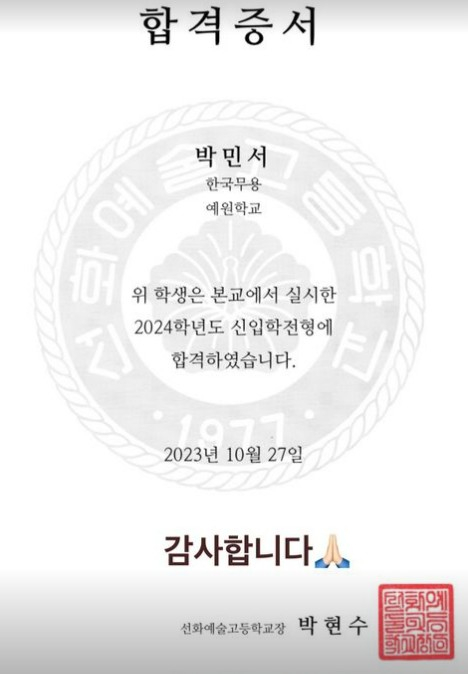 박명수의 아내 한수민은 27일 딸 민서의 서울 선화예술고등학교 신입학 전형 합격 소식을 알렸다. 공개된 합격 증서에는 민서의 이름과 함께 '위 학생은 본교에서 실시한 2024학년도 신입학 전형에 합격하였습니다'라고 적혀 있다.