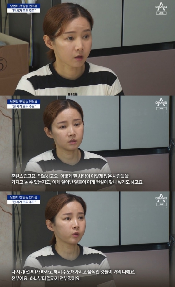 남현희는 지난 27일 방송된 채널A '뉴스A'와의 인터뷰에서 "혼란스럽고 억울하다. 어떻게 한 사람이 이렇게 많은 사람을 가지고 놀 수 있는지, 이게 일어난 일들이 현실이 맞나 싶기도 하다"며 "다 자기(전청조)가 하자고 해서 주도해 가지고 움직인 것들이다. 하나부터 열까지 전부였다"고 밝혔다.
