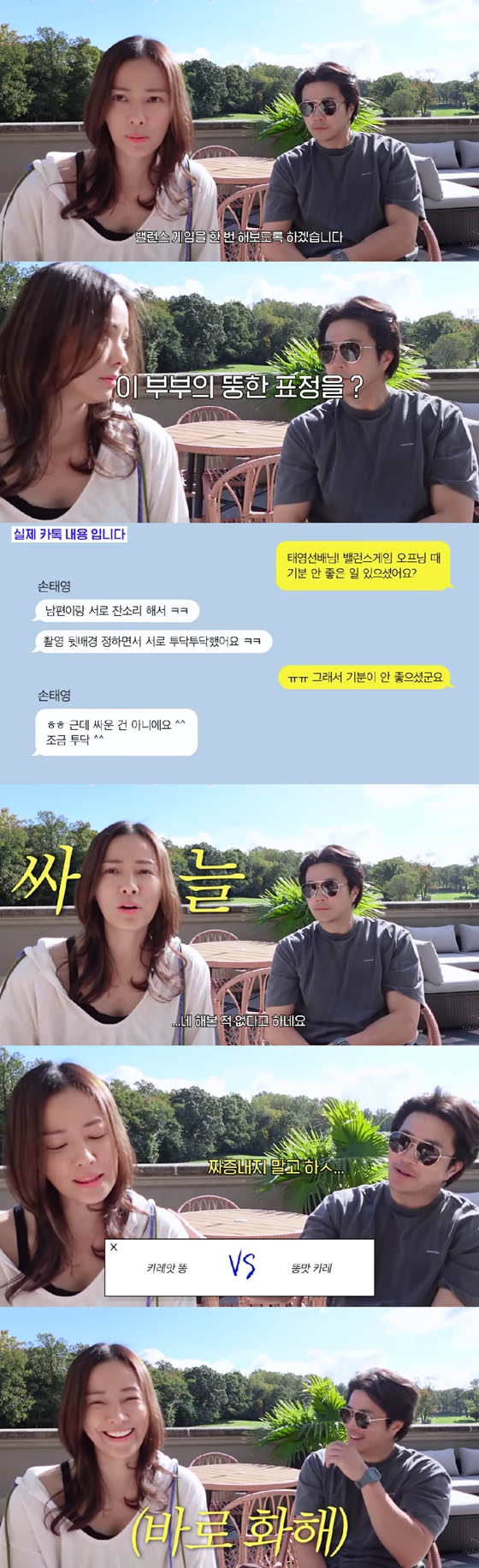 이런 상황에 대해 유튜브 제작진은 손태영과 나눈 메신저 대화를 공개했다. 제작진이 손태영에게 "밸런스 게임 오프닝 때 기분 안 좋은 일 있었냐"고 묻자 손태영은 "남편이랑 서로 잔소리를 해서. 촬영 뒷배경 정하면서 서로 투닥거렸다"고 답했다.