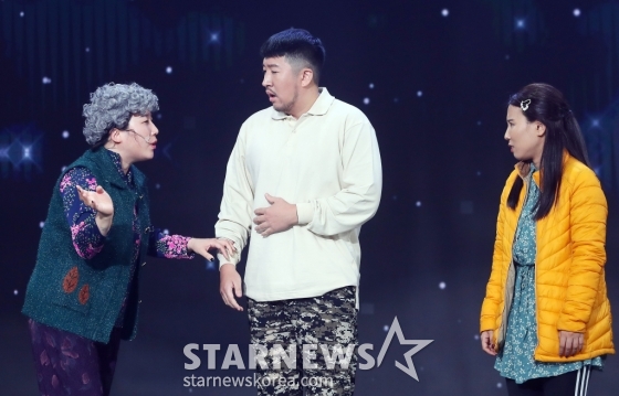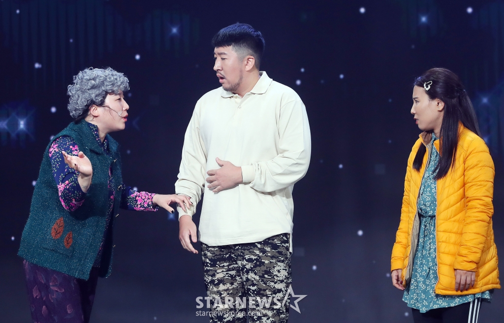 코미디언 김영희, 박형민, 김지영이 1일 오후 서울 영등포구 여의도동 KBS 별관에서 진행된 '개그콘서트' 제작발표회에서 '니퉁의 인간극장' 코너를 시연하고 있다
