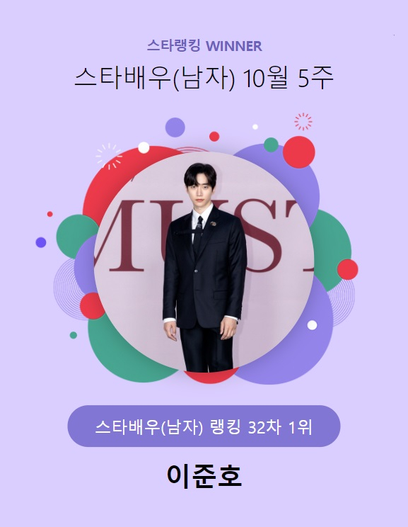 이준호는 지난 26일 오후 3시 1분부터 11월 2일 오후 3시까지 진행된 10월 5주(32차) 스타랭킹 스타배우 남자 랭킹 투표에서 1만 7712표를 얻으며 31주 연속 1위를 차지했다.