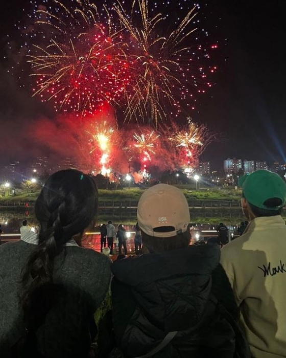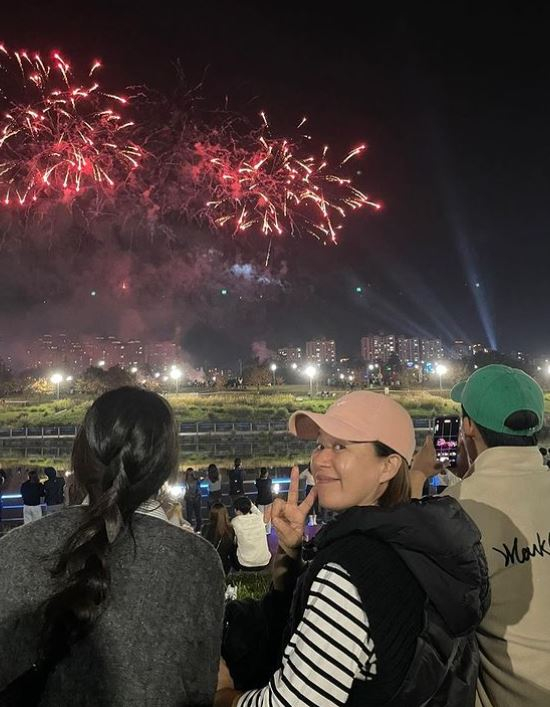 박미선은 손가락 브이(V)를 그리며 미소를 지어 훈훈함을 안겼다. 양 옆으로 앉은 자녀들도 불꽃놀이에 집중한 모습이다.