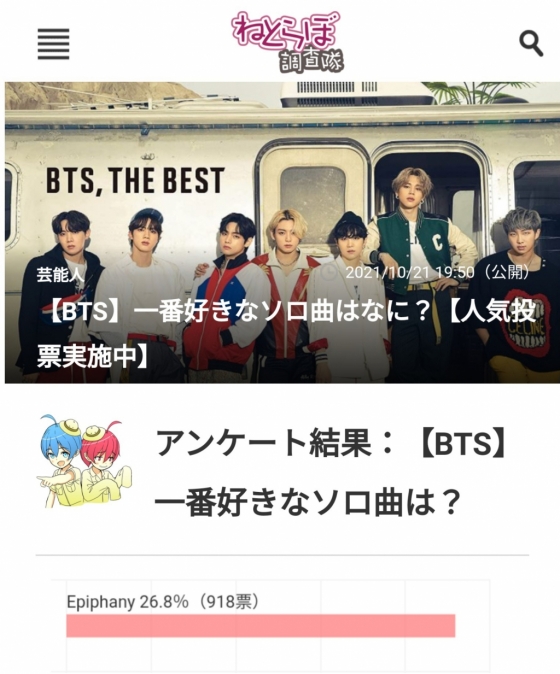 '에피파니'는 일본 네토라보(Netorabo)가 진행한 "방탄소년단 솔로곡 중 가장 좋아하는 곡은 무엇인가?"라는 설문에서 1위를 차지하기도 했다. 네토라보의 투표는 일본인만 참여가 가능하고, 중복 투표가 아닌 한번의 투표만 가능하다.