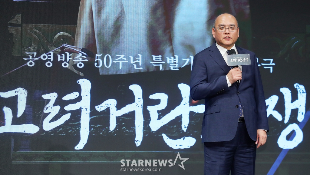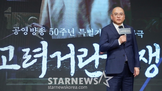 김덕재 KBS 부사장이 9일 오후 서울 구로구 더 세인트 웨딩홀에서 진행된 KBS 2TV 대하드라마 '고려 거란 전쟁' 제작발표회에 참석해 인사말을 하고 있다.