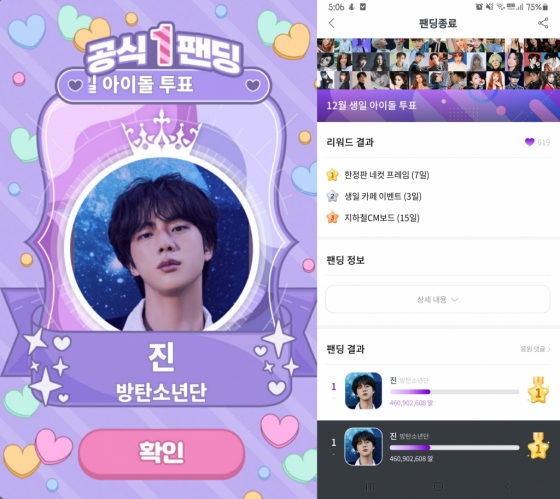 진은 포도알에서 진행된 '12월 생일 아이돌' 투표에서 1위를 차지했다.