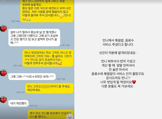 이후 영숙은 해당 사건을 걱정하는 팬들을 위해 추가 글을 남겼다. 그는 "언니(정숙)께서 볶음밥, 음료수 서비스 주셨다고 한다"며 "언니 바쁘셔서 먼저 가셨고 계산할 때 아무 말 안 하시고 전 술만 마셔서 음료수와 볶음밥이 서비스인지 몰랐다"고 설명했다.