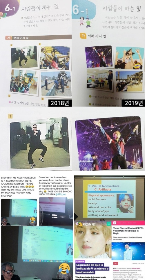 뷔는 미국 대학교의 수업에도 등장해 화제에 오른 바 있다. 2019년 9월, 미국에 사는 대학생 팬은 문화, 패션 수업 도중파워포인트 교재에 등장한 뷔의 사진을 보고 깜짝 놀라며 SNS에 이를 공유했다. 뷔는 비언어적 비주얼에 대한 강의 중외모 부분에서 '아름다움'의 예시로 등장했다.