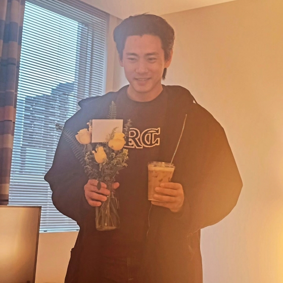 사진 속 유태오는 후디 집업을 입은 채 꽃이 든 화병과 아이스라떼를 들고 환하게 웃고 있는 모습. 유태오는 듬직하면서도 어린 아이처럼 귀여운 면모를 뽐내며 전 세계 여심을 저격했다.