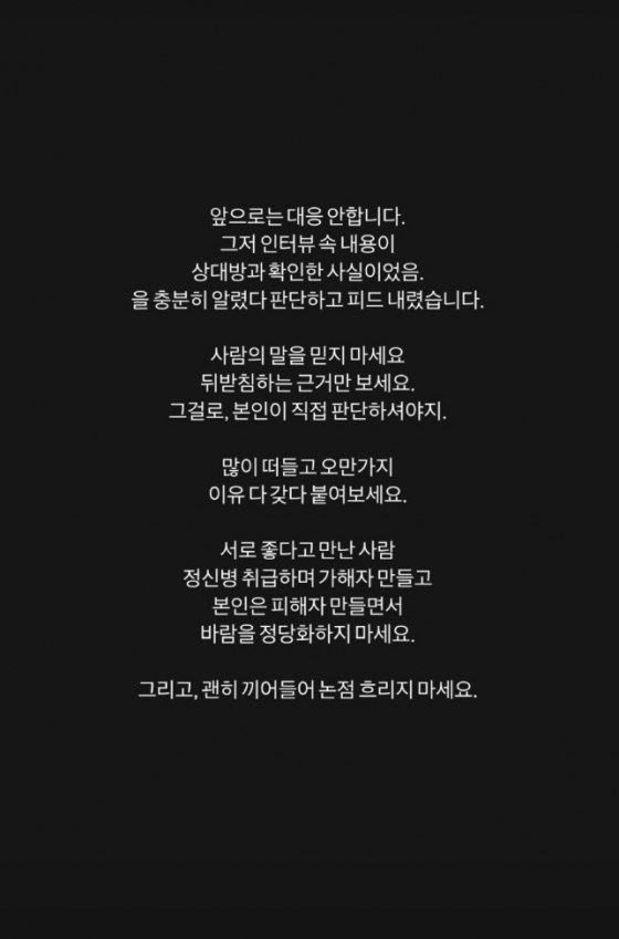 이어 "사람의 말을 믿지 마라. 뒷받침하는 근거만 봐라. 그걸로, 본인이 직접 판단하셔야지"라며 "많이 떠들고 오만가지 이유 다 갖다 붙여봐라. 서로 좋다고 만난 사람 정신병 취급하며 가해자 만들고 본인은 피해자 만들면서 바람을 정당화하지 마라. 그리고 괜히 끼어들어 논점 흐리지 마라"고 전했다.