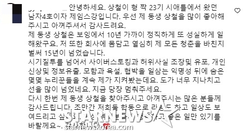 이어 상철 친형도 해당 게시글에 "안녕하세요. 상철이 형이자 SBS '짝' 23기 시애틀에서 왔던 남자 4호인 제임스강이다. 우선 내 동생 상철을 많이 좋아해주시고 아껴주셔서 감사하다"라며 "동생 상철은 보잉에서 10년 가까이 정직하게 또 성실하게 일해왔다. 나 또한 회사에 몸 담고 열심히 내 모든 청춘을 받친지 벌써 15년이 넘었다. 시기 질투를 넘어 사이버 스토킹과 허위사실 조작 및 유포, 개인 신상 및 정보 유출, 모함과 욕설, 협박을 일삼는 익명성 뒤에 숨은 몇몇 누리꾼들을 계속 지켜봤다. 도가 너무 지나치고 선을 많이 넘었다. 지금 당장 멈춰달라"라고 강조했다.