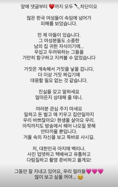 이후 영숙은 21일 "많은 한국 여성들이 속임에 넘어가 피해를 봤다"라며 "전 제 아들이 있다. 그 여성분들도 소중한 남의 집 귀한 자식이기에 무섭고 두려워하는 그들을 가만히 함구하고 지켜볼 수 없었다"라고 적었다.