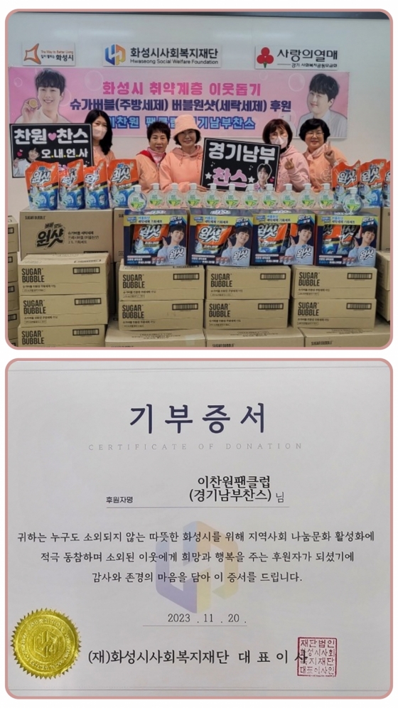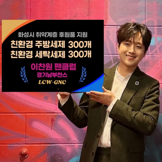 이찬원 팬클럽 '경기남부찬스'는 경기 화성시에 친환경 세제를 기탁했다.