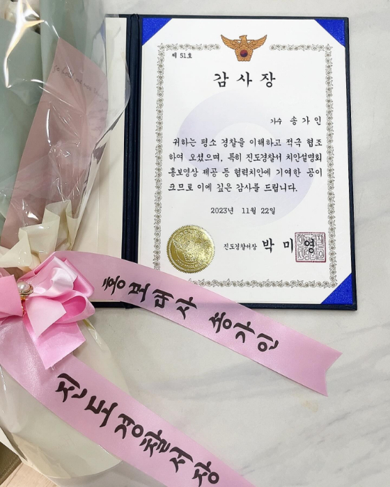공개된 사진은 지난 22일 진도경찰서장으로부터 송가인이 감사장을 받은 모습이 담겼다. 또 감사장에는 송가인이 평소 경찰을 이해하고 적극 협조, 특히 진도경찰서 치안설명회 홍보영상 제공 등 협력치안에 기여한 공이 크다는 내용이 담겼다.
