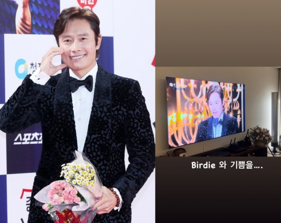 이에 이민정은 자신의 인스타그램에 이병헌 남우주연상 수상 당시 화면을 캡처해 "Birdie와 기쁨을"이라고 축하했다.
