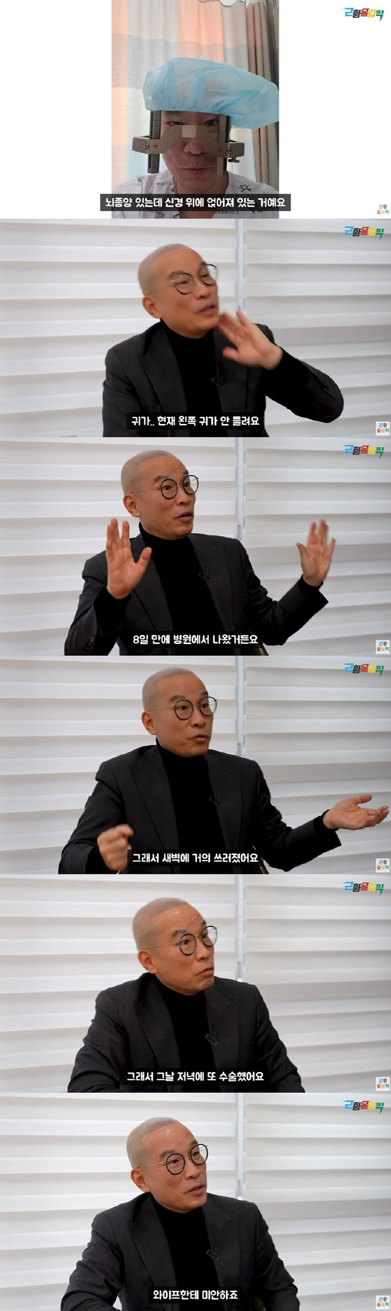 또 "뇌종양이 신경 위에 얹어져 있었다. 지금 왼쪽 귀가 안 들린다. 귀로 가는 청신경 위에 종양이 있어서 신경을 잃었고, 이명이 들린다. 18시간 동안 뇌종양 수술을 했다. 거의 죽다 살아났다"고 아찔했던 당시를 떠올렸다.