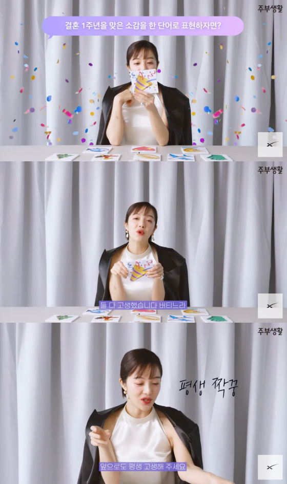 황보라는 지난 1년을 "한 마디로 표현하자면 '고생했다'"라며 "둘다 고생했다. 버티느라. 앞으로도 평생 고생해주세요"라 전해 애정을 드러냈다. 황보라는 또 영상 말미 "오늘 오랜만에 둘만의 저녁 파티를 예약해놨다. 초밥 먹으러 가기로 했다"며 달달함을 자아냈다.