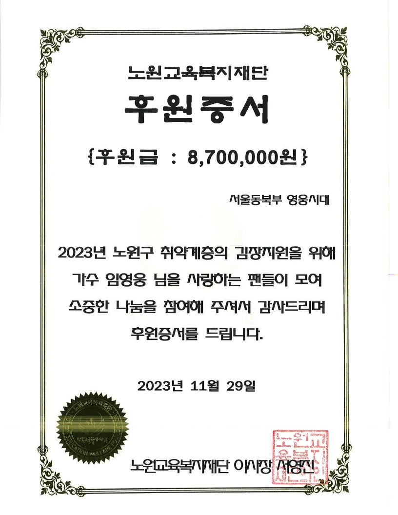 임영웅 팬클럽 서울 동북부영웅시대는 11월 29일 노원교육복지재단 '희망나눔 김장행사'에 후원금을 870만 원을 전달하고 김장 봉사 활동에 참여했다.
