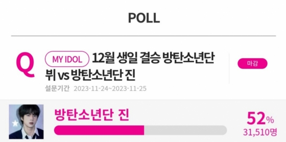 방탄소년단(BTS) 진이 12월 생일 스타 투표에서 1위를 차지하며 축하 영상의 주인공이 됐다.