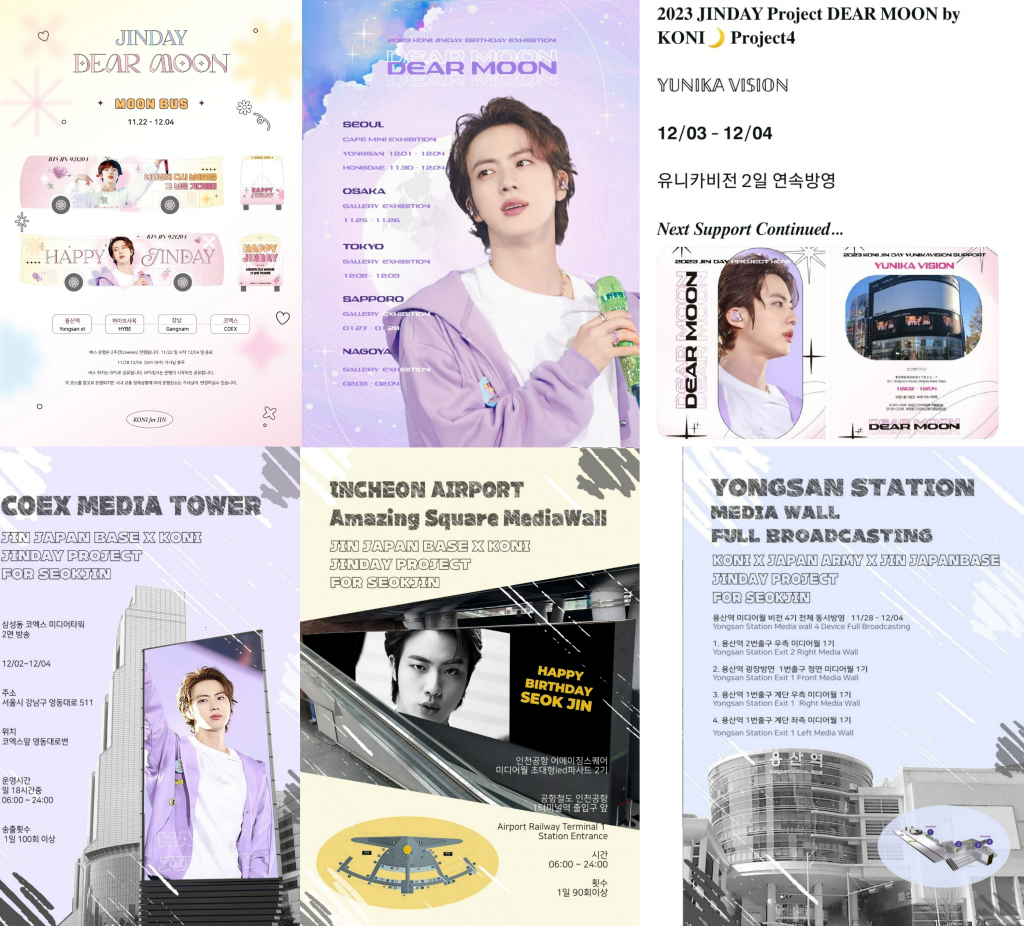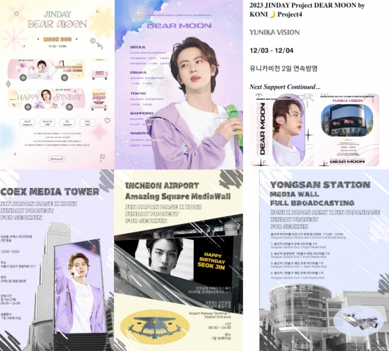 KONI는 또 진의 일본 팬 베이스 JIN JAPAN FANBASE(@JP_Jinfanbase)와 함께 삼성동 코엑스 미디어타워에서 12월 2일부터 4일까지 1일 100회 이상 진의 생일 축하 영상 광고를 송출한다. 12월 1일부터 14일까지 인천 공항 어메이징스퀘어 미디어월 초대형 LED 파사드 양방향 2기와 11월 28일부터 12월 4일까지 용산역 미디어월 비전 4기 전체에도 진의 생일 축하 영상 광고를 동시 방영, 용산역을 진의 생일 축하로 가득 채운다.