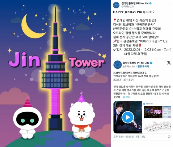 또한 A LITTLE BRAVER는 진의 한국 서포터즈인 김석진 홍보팀(@PRforJIN), 일본 진 서포터즈인 WAIT FOR JIN JAPAN(@WaitForJIN_BTS)과 함께 연예인 최초로 서울N타워(구 남산타워)에서 12월 4일 오후 6시 30분부터 진의 화려한 생일 축하쇼를 진행한다.