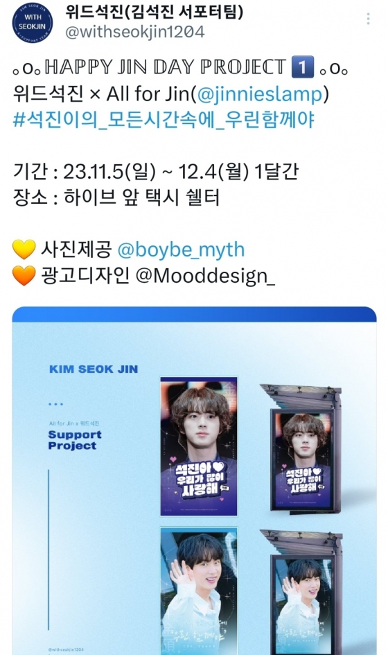 진의 한국 팬 서포터즈인 위드석진(@withseokjin1204)과 또 다른 진 팬 계정 올포진(@jinnieslamp), 그리고 BOY BE MYTH는 하이브 앞 택시 쉘터에 11월 5일부터 12월 4일까지 한 달간 진의 광고를 진행하고 있다.