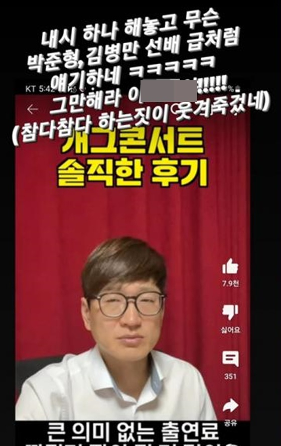 김원효는 지난달 30일에도 "내시 (역할) 하나 해놓고 무슨 박준형, 김병만 선배 급처럼 얘기하네. 그만해라, 이 XX야. 내가 참다 참다가 하는 짓이 웃겨 죽겠네"라며 코미디언 출신 유튜버 김영민의 영상을 함게 게재했다.