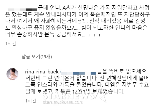 또 다른 네티즌은 "근데 언니, A씨가 실명 나온 카톡 지워달라고 사정했는데도 계속 안 내리시다가 이제 옥순 때처럼 또 차단 당하고 나서 여기서 왜 사과하시는 거냐. 진작 내리셨으면 서로 감정도 안 상하고 좋지 않았나"라고 묻자, 그는 "글을 똑바로 읽어라. 나한테 그런 연락이 온 거 없었다. 난 변혜진 님에게 물어 그쪽 SNS 계정과 카톡을 물었습니다. DM은 저번 주 수요일에 보냈고, 카톡은 12월 1일 보내었다"라고 전했다.