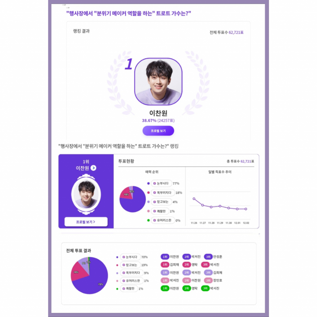 이찬원의 매력으로는 77%의 지지율로 '눈부시다'가 1위를 차지했다. 이찬원은 전체 매력 순위에서도 '눈부시다'에서 1위를 차지했다.