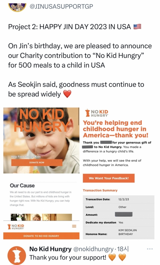 미국의 진 팬 베이스(@JINUSASUPPORTGP)는 진의 생일을 위한 뉴욕 타임스 스퀘어 광고와 생일 카페 등의 서포트와 함께 미국 내 지역사회에 취약한 어린이의 성장에 필요한 영양가 있는 음식을 제공하는 단체 'No Kid Hungry(@nokidhungry)'를 통해 미국 어린이들에게 500끼의 식사를 제공했다.