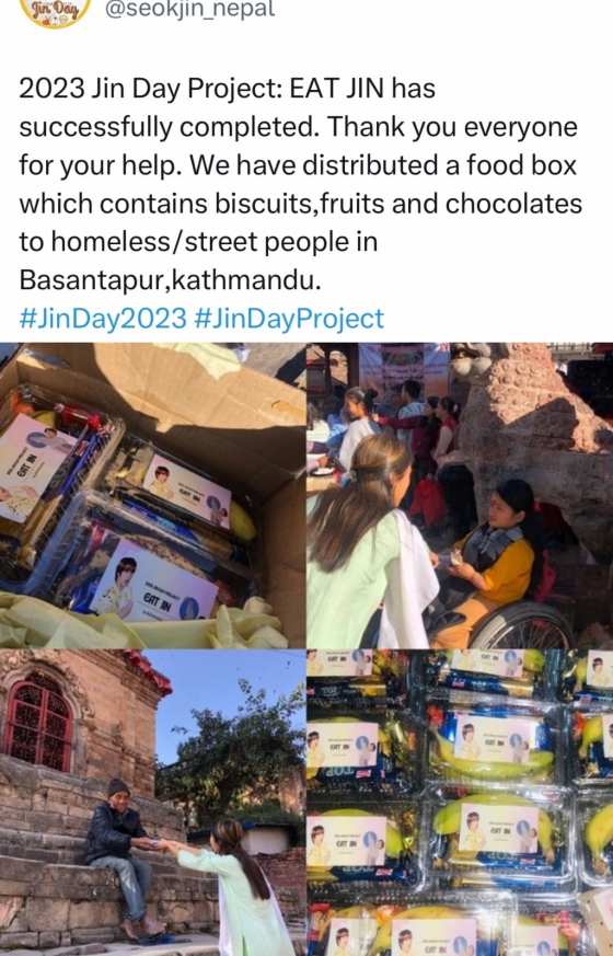 네팔의 진의 팬 베이스(@seokjin_nepal)는 진이 방탄소년단 유튜브 공식계정에 있던 채널 잇진(EAT JIN)을 본 딴 잇진 프로젝트를 성공적으로 완료했음을 알렸다. 진의 네팔 팬들은 카트만두 바산타푸르의 노숙자들에게 비스킷과 과일, 초콜릿이 담긴 음식 상자를 배포하며 진의 선한 영향력을 나누며 진의 생일을 축하했다.