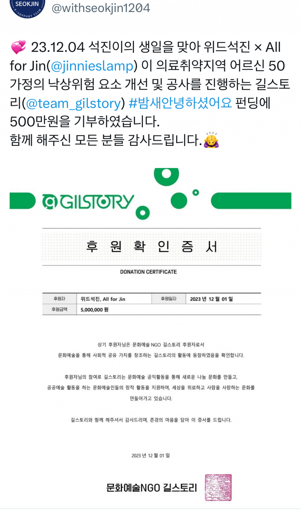 진의 한국 팬 베이스 위드석진(@withseokjin1204)과 글로벌 팬 베이스 All for Jin(@jinnieslamp)이 함께 진의 생일을 맞아 의료취약지역 어르신 50가정의 낙상위험 요소 개선 및 공사를 진행하는 길스토리(@team_gilstory) '밤새 안녕하셨어요 펀딩에 500만 원을 기부했다.
