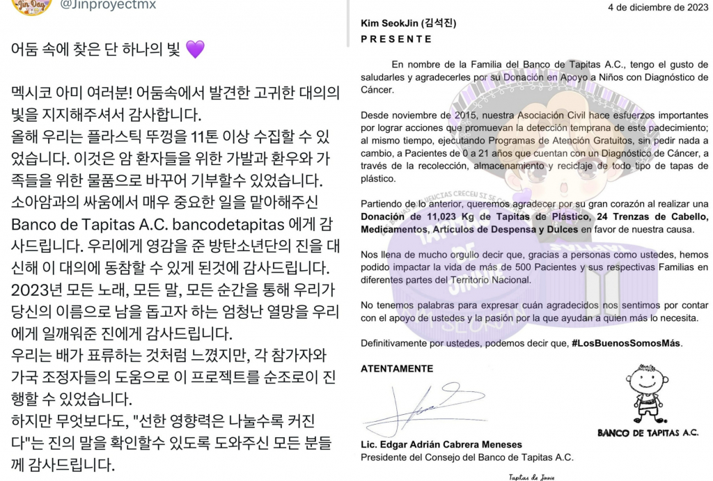 멕시코의 진 팬 베이스(@Jinproyectmx)는 멕시코 아미(ARMY, 팬덤명)들이 함께 플라스틱 뚜껑 11톤 이상을 모아 암 환자들을 위한 가발과 환우 가족을 위한 물품을 기부했다고 밝혔다.