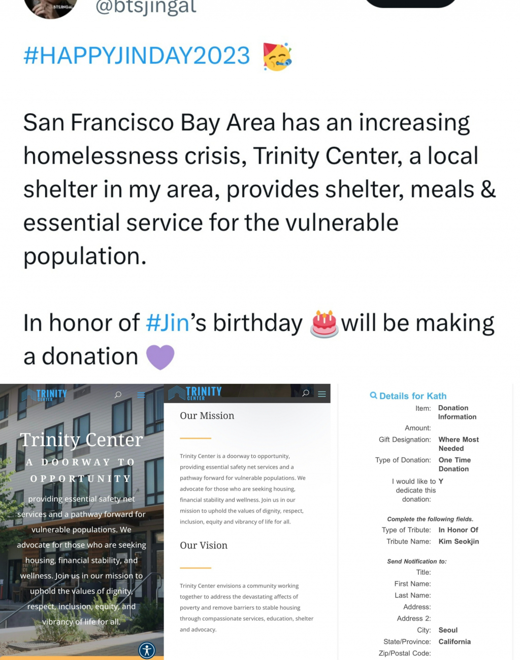 기부와 봉사 물결이 계속 되고 있다. 미국의 한 팬(@btsjingal)도 석진이의 생일을 기념해 노숙자 위기가 증가하고 있는 샌프란시스코 베이 지역 취약 계층을 위해 보호소와 식사 및 필수 서비스를 제공하는 트리니티 센터에 기부한 소식을 전했다.